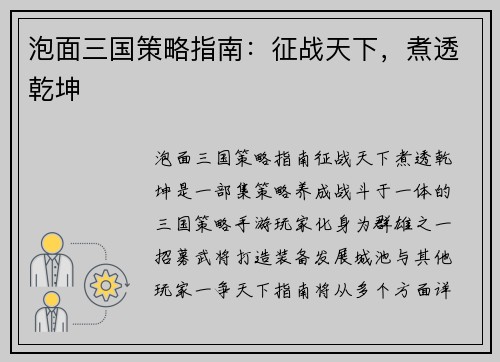 《泡面三国策略指南:征战天下,煮透乾坤》是一部集策略、养成、战斗于一体的三国策略手游。玩家化身为群雄之一,招募武将,打造装备,发展城池,与其他玩家一争天下。指南将从多个方面详细阐述如何玩好泡面三国,助玩家煮透乾坤,征战天下。